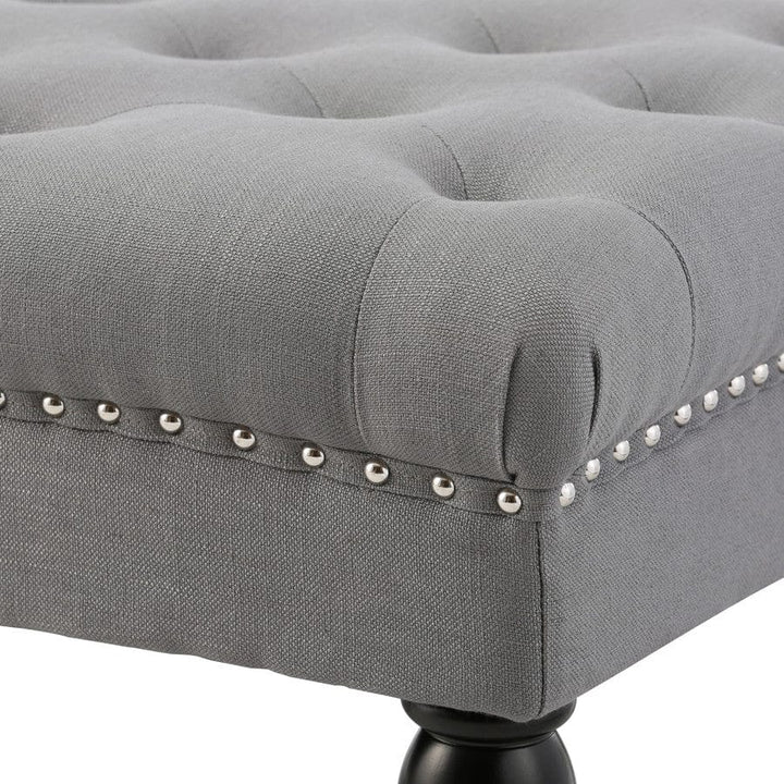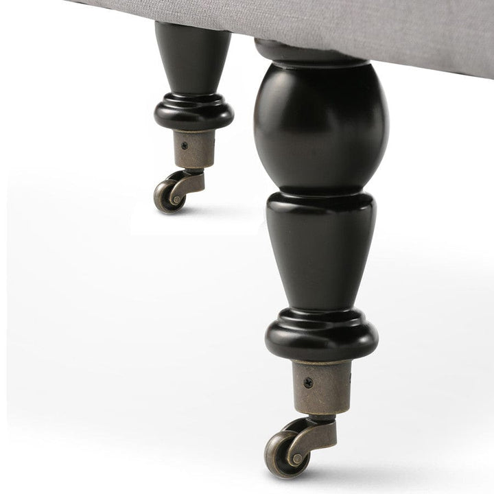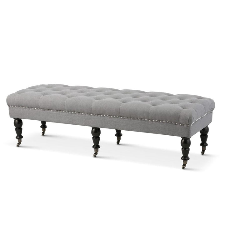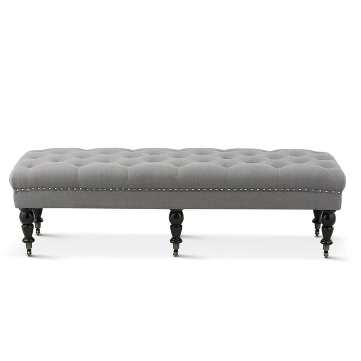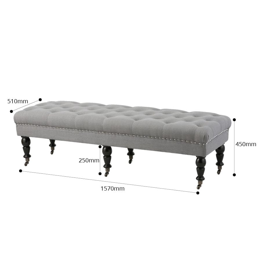 The Emilie Dressing Bench exudes charm and elegance with its chesterfield cushioning, heavy duty linen blend fabric, glossy black turned legs, and antique castors. It's perfect for any space and can serve as a beautiful bench seat by the end of your Queen or King size bed, or as a statement piece in your home or hotel.