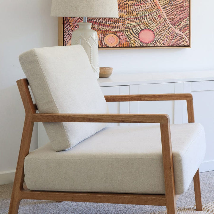 This solid oak Stanford Arm Chair is the perfect chair to laze the afternoons away. Handmade from the finest materials and upholstered in a heavy duty linen blend fabric it's the essence of mid-century Danish design. The perfect statement piece for the den or sitting room.