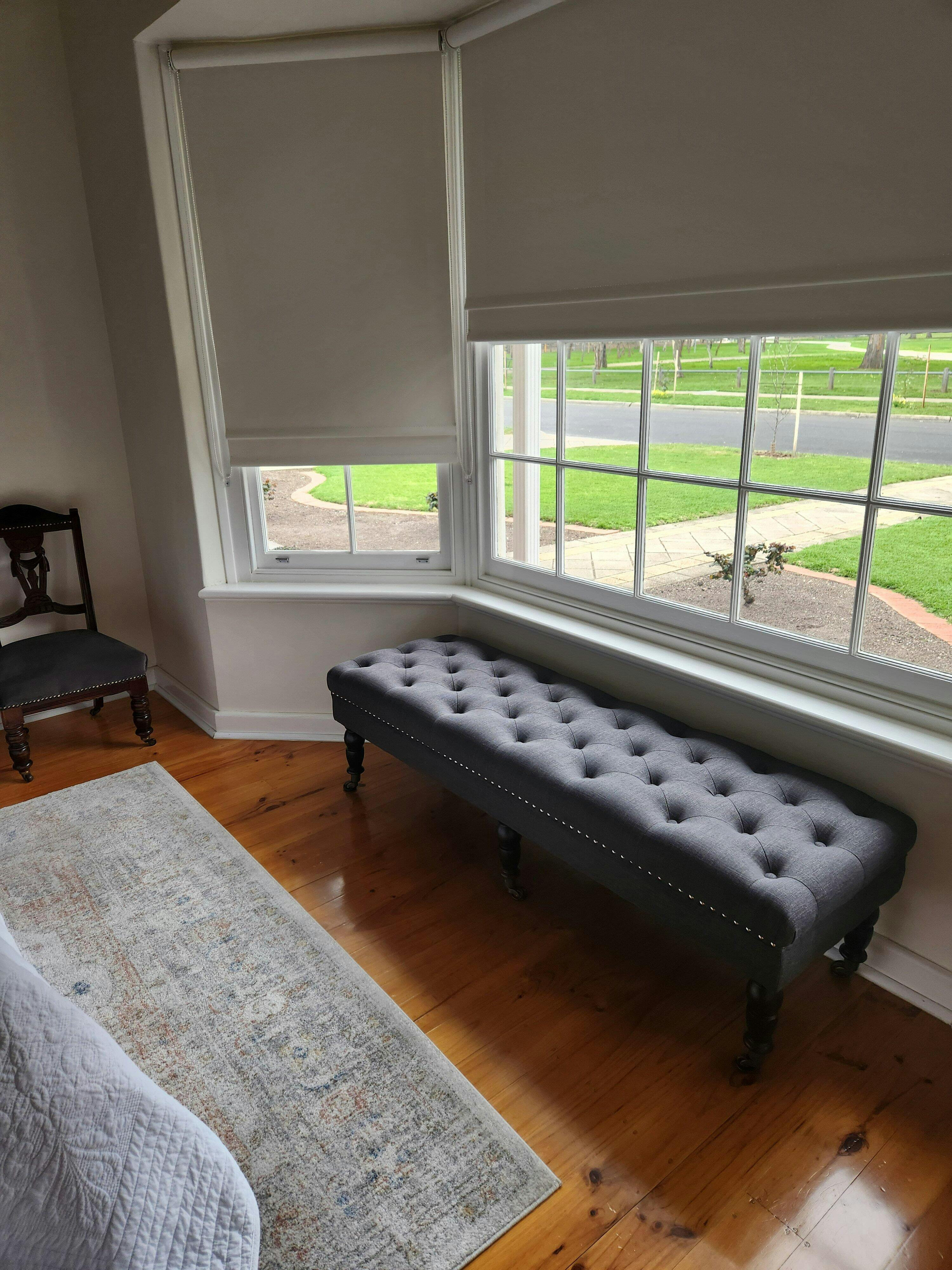 The Emilie Dressing Bench exudes charm and elegance with its chesterfield cushioning, heavy duty linen blend fabric, glossy black turned legs, and antique castors. It's perfect for any space and can serve as a beautiful bench seat by the end of your Queen or King size bed, or as a statement piece in your home or hotel.